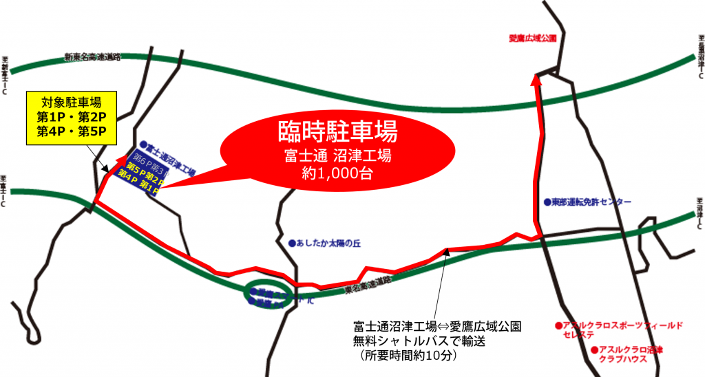 渋滞緩和のため、愛鷹広域公園内駐車場ではなく富士通沼津工場駐車場を積極的にご利用いただき、パークアンドライドとして運行する無料シャトルバスでご来場することをご検討ください。