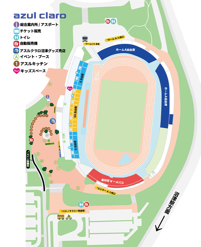 ・それ以外の席種はアスルクラロ沼津の応援席となりますので、ビジターチームグッズの着用しての応援はできません。