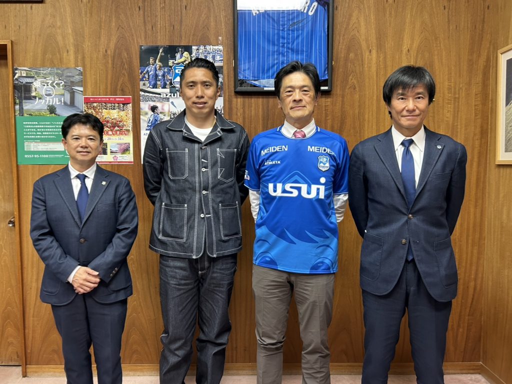 3/4(水)クラブ代表 高島雄大、中山雅史 C.R.O.、#1 大久保択生 選手が、東伊豆町役場を訪問しました。