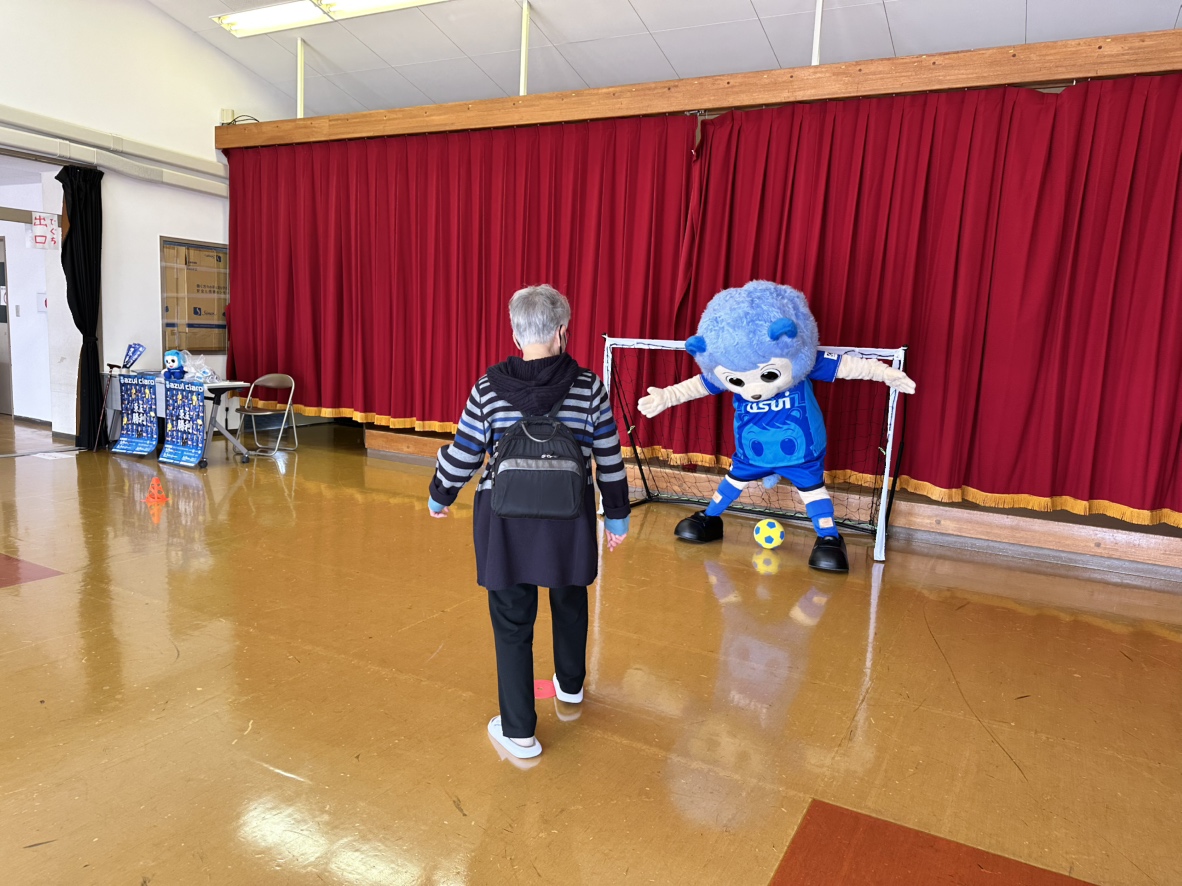 2階の遊戯室ではアスルくんがゴールキーパーを務め、PK対決を行ました。