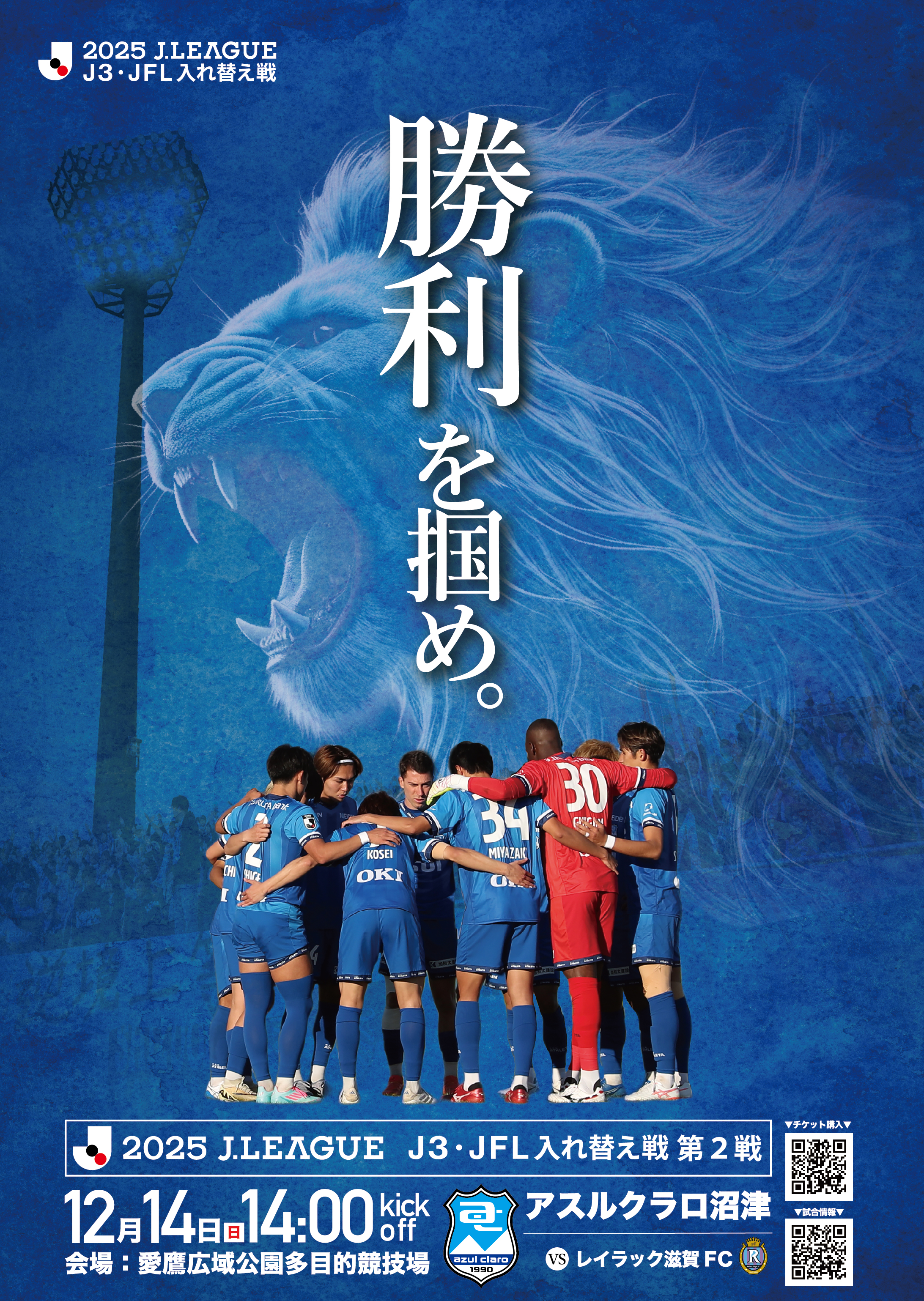 また、入れ替え戦勝利のために1人でも多くの皆さまに愛鷹広域公園多目的競技場へ足を運んでいただけるよう、ファン・サポーターの皆さまにはポスター掲出のご協力をお願い申し上げます。