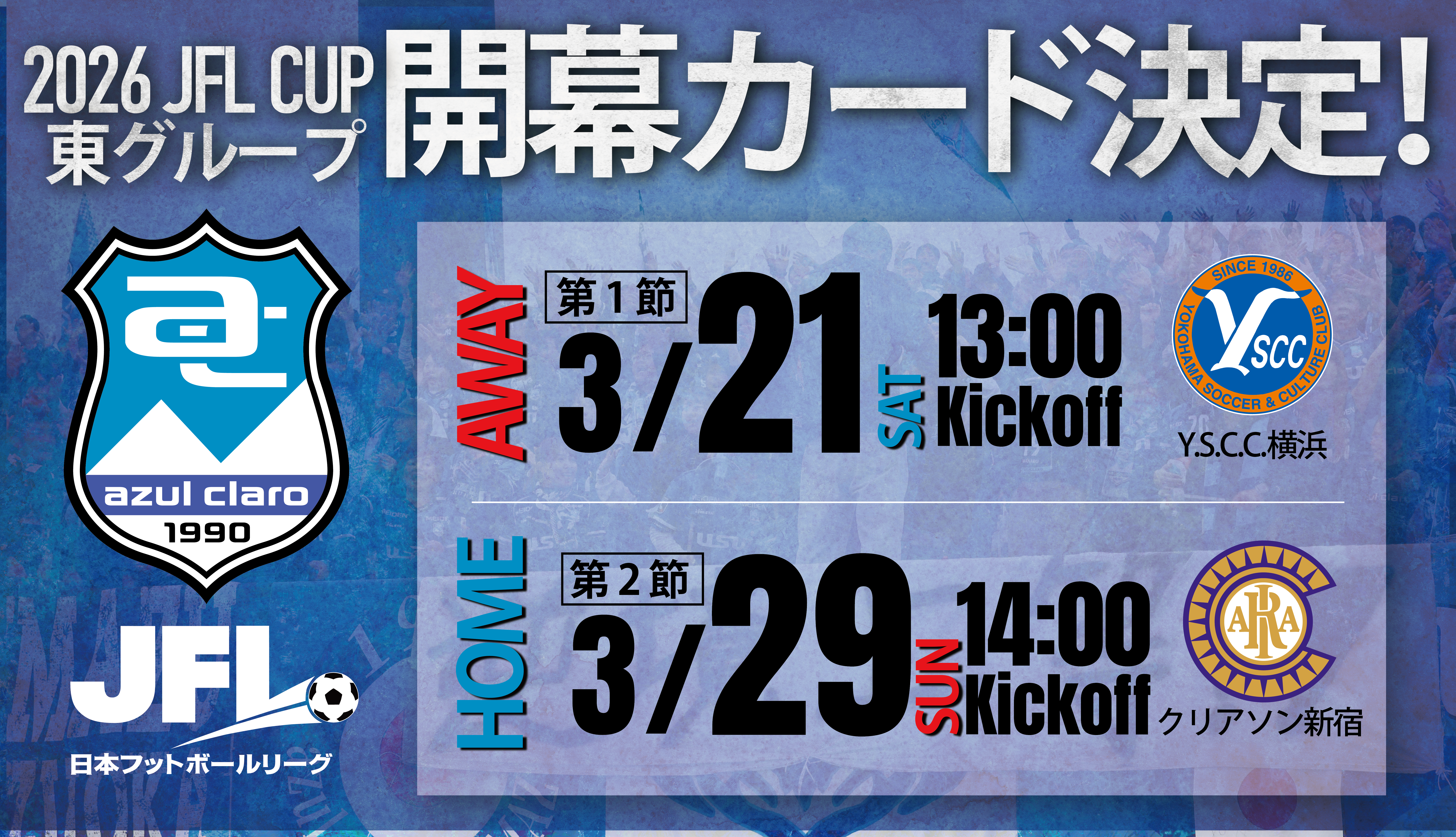 このたび、2026年度 JFL CUP (仮称)の第1節・第2節の日時と対戦カードが発表されましたので、お知らせいたします。