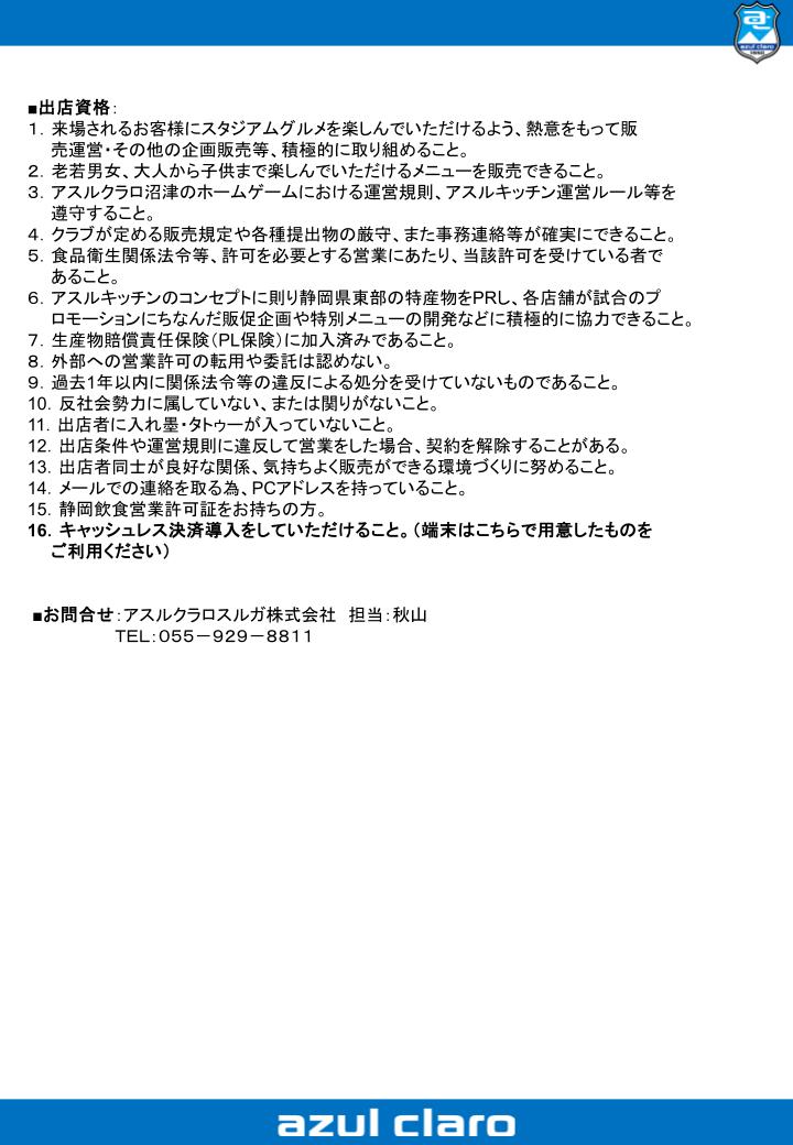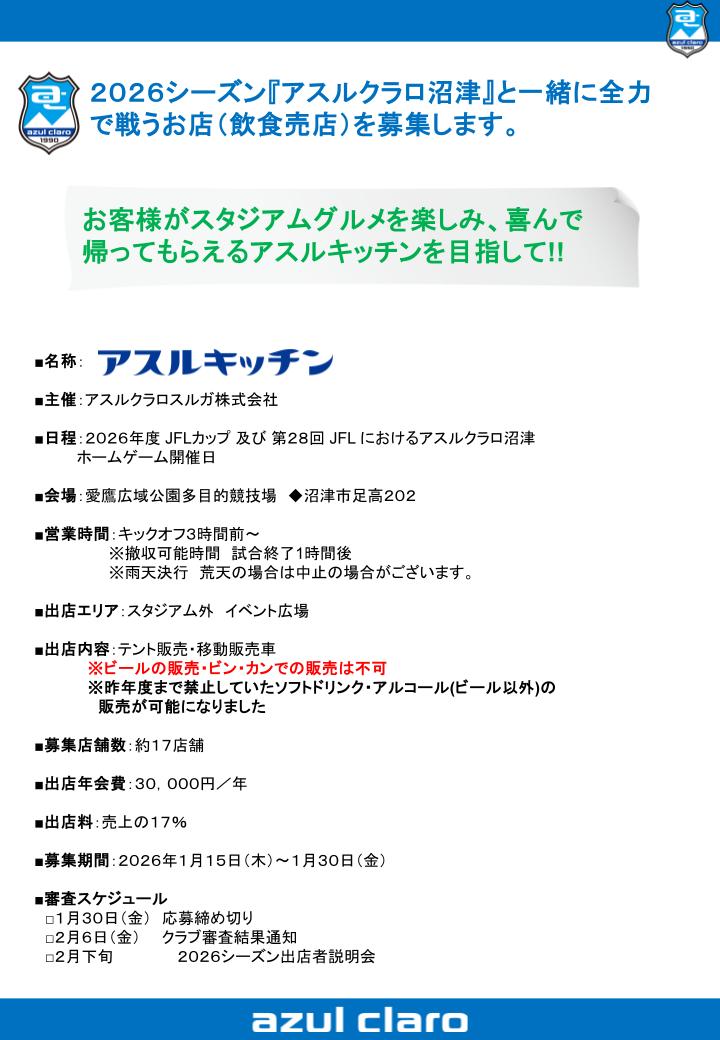 2026ー27シーズン『アスルキッチン』募集のお知らせ 2026/01/15 2026年度JFLカップ(2026年3月~6月)並びに第28回JFL(2026年8月~2027年5月)のアスルクラロ沼津 ホームゲームに出店していただく『アスルキッチン』を募集いたします。 スペシャルシーズンを含む1.5年を一緒に『全力』でスタジアムを盛り上げていただける店舗様、沢山のご応募お待ちしております!! 内容をご確認いただき、お申込をお願いいたします。 最新一覧 次の記事へ HOME ニュース 2026ー27シーズン『アスルキッチン』募集のお知らせ