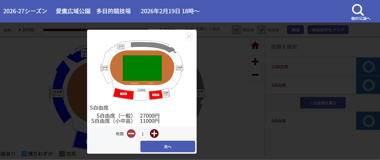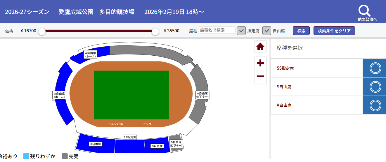 ・SS指定席をご購入希望の場合は座席をご指定ください。(青い箇所が購入可能席となります)